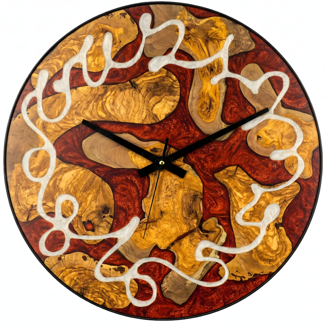 ZEYTİN AĞACI KIRMIZI & BEYAZ EPOXY ÇEMBERLİ DUVAR SAATİ – Ø48cm